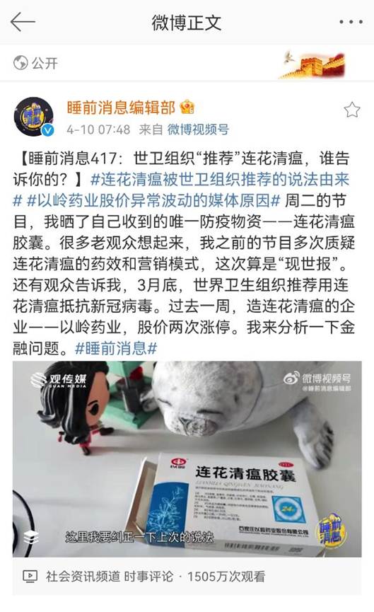 3、微博用户“睡前消息编辑部” 4月10日发布《世卫组织“推荐”连花清瘟,谁告诉你的?》,指出人民网文章做了巧妙的内容拼接。世卫组织的报告中确实有中方专家向世卫组织成员国推荐中药,但是整个报告的正文17页没有一处没有提到连花清瘟。