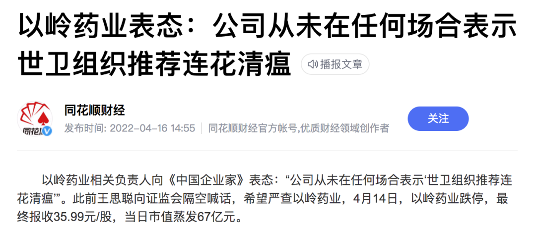 5、以岭药业当天股价并未下跌,还涨了不少,后来舆论持续发酵,4月15日以岭药业跌停,最终报收35.99元/股,当日市值蒸发67亿元。以岭药业相关负责人表态:“公司从未在任何场合表示‘世卫组织推荐连花清瘟’”。