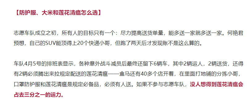 6、“为你写一个故事”公众号4月16日发布文章《我在盒马当司机,才明白在上海送菜到底难在哪》,提到连花清瘟占据了一些志愿者三分之一运力,引起舆论争议,因为目前上海的运力高度紧张,很多居住上海的网友称拿到药的频率远比食物高。