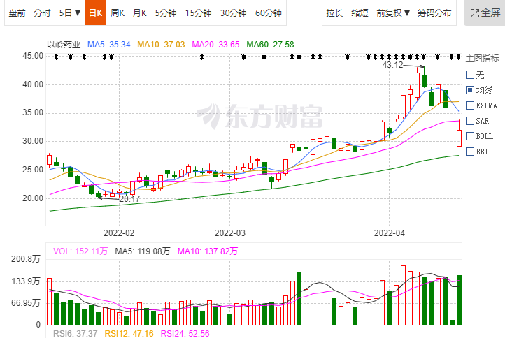 交易行情显示,4月18日,以岭药业以跌停价32.39元/股开盘,开盘后还出现了一笔1.54亿元的巨额抛单。截至当日收盘,以岭药业封死跌停,总市值为541.1亿元。