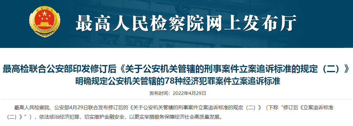 4月29日,最高人民检察院和公安部发布《关于公安机关管辖的刑事案件立案追诉标准的规定(二)》的通知公布,对公安机关管辖的78种经济犯罪案件立案追诉标准予以进一步明确规定,自2022年5月15日施行