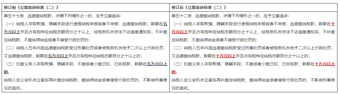 逃税罪的立案追诉标准从修订前的“五万元以上”提升为修订后的“十万元以上”,提高了立案追诉的金额,更加符合目前经济社会发展的特点,也为相关行政处罚保留了更多的裁量空间、体现了刑法的谦抑性。