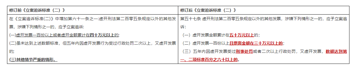 1. 将虚开发票金额从修订前的“四十万元以上”提升为修订后的“五十万元以上”,提高了立案追诉的金额,更加符合目前经济社会发展的特点,也为相关行政处罚保留了更多的裁量空间。