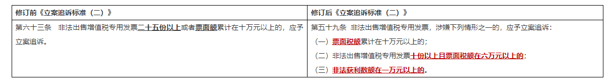 1.对非法出售增值税专用发票的份数进一步做出了规定,由修订前的“二十五份以上”降低为“十份以上”,但同时补充了票面税额的要求,体现对该行为的实际影响或危害的重视,表述更加合理;