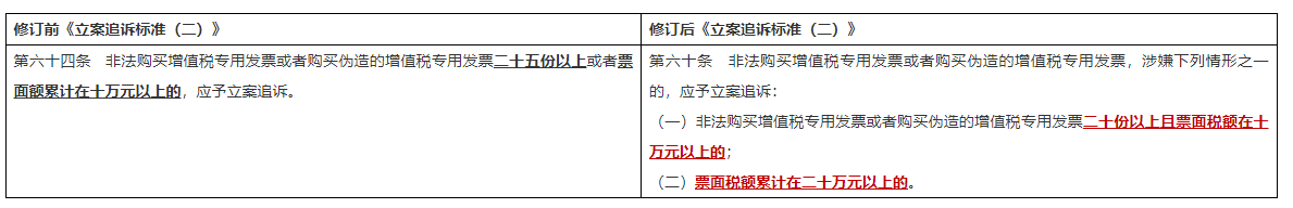 五、非法购买增值税专用发票、购买伪造的增值税专用发票罪,由修订前的“二十五份以上”降低为“二十份以上”