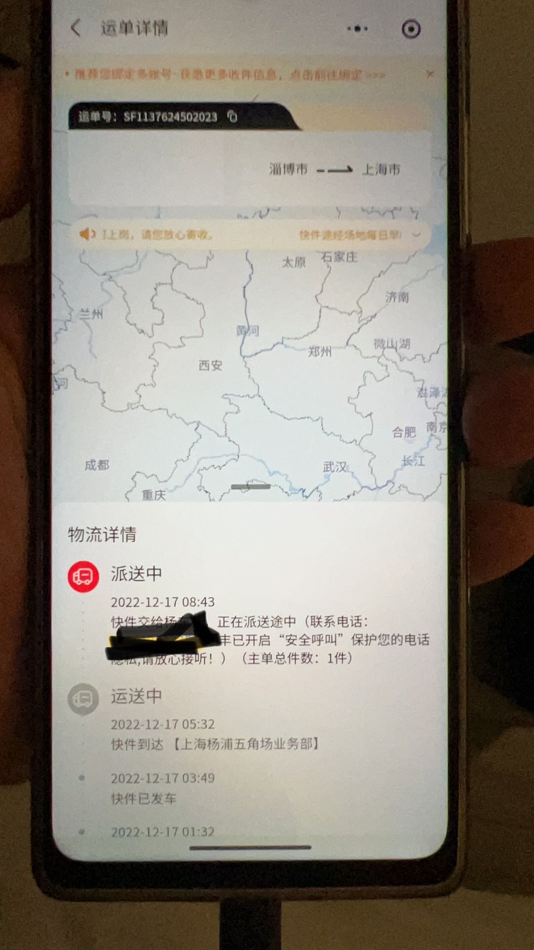 12月17日顺丰快递终于到了杨浦分部,然后显示扫码给了派送员送货!谁知到了第二天也没有到!