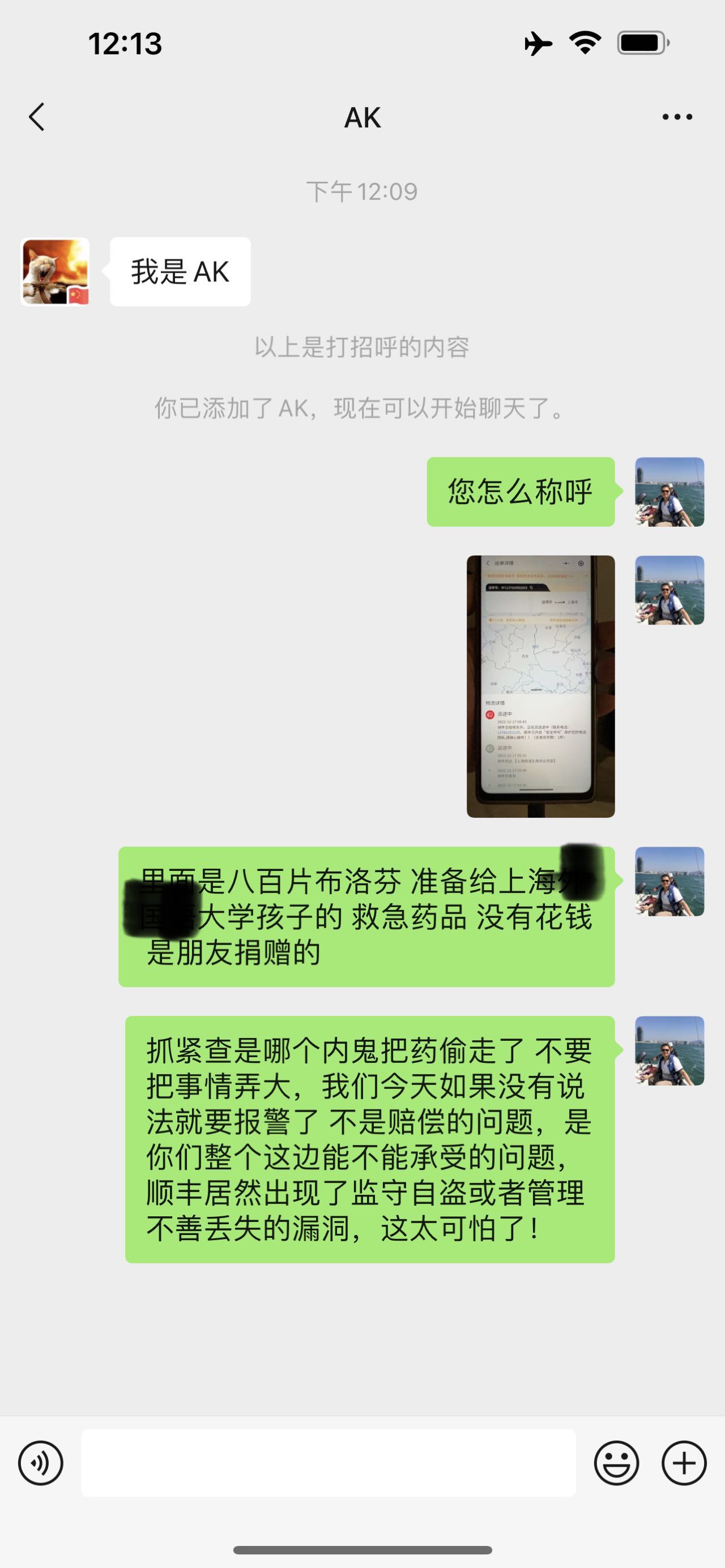 学生们已经很急了,然后却得到了一个噩耗,药品不翼而飞,经常给我们送货到顺丰的孩子说他根本没有收到这个件,我们也绝对相信他,于是打了他的几个领导,也加了一个人的微信。