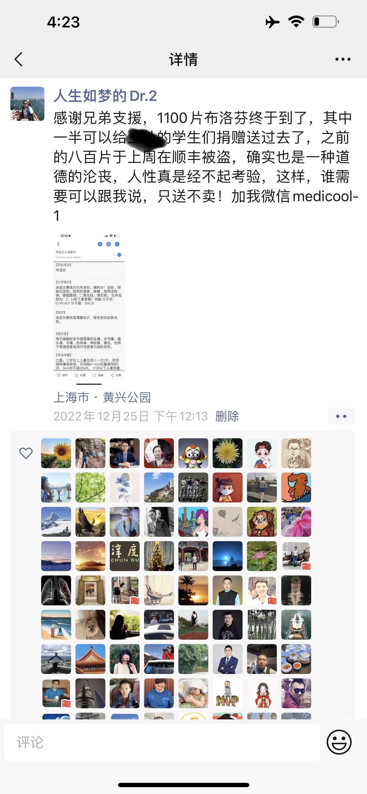 于是我到处寻找托朋友的朋友的朋友去寻找,但人生就是这么巧,有一个深圳的好朋友宋总他其实在中药厂,并没有看到我的求助,我也根本没有想到他会有,他却主动给我发信息问我是否需要布洛芬,我说多多益善,他一分钱也没有收我的,直接捐了八瓶药,八百片布洛芬,然后之前我就跟大学说好准备绝大部分都捐掉,剩下给我的朋友们。我们一致决定顺丰是我们最信任的快递,发顺丰吧!