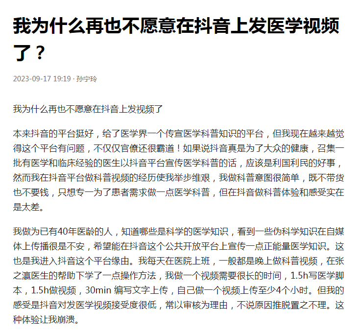 近日,医学专家孙宁玲医生发表了一篇关于“再也不愿意在抖音上发医学视频”的文章,描述了她在抖音平台发布医学视频遇到的各种阻碍和不良体验。