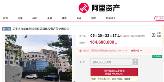接受拍卖的医院为“大连华庚医院”,起拍价18468万元,于10月26日进行竞拍。此次拍卖的是大连华庚医院的房产及100%股权。