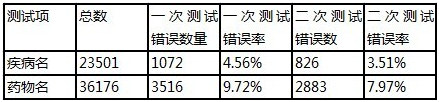 汉字较少,而药品种类要远多于疾病种类,其中生僻汉字也较多。二次测试的正确率较一次测试大约提升了一个百分点左右,还是可以适当减少错误数据库中的词汇