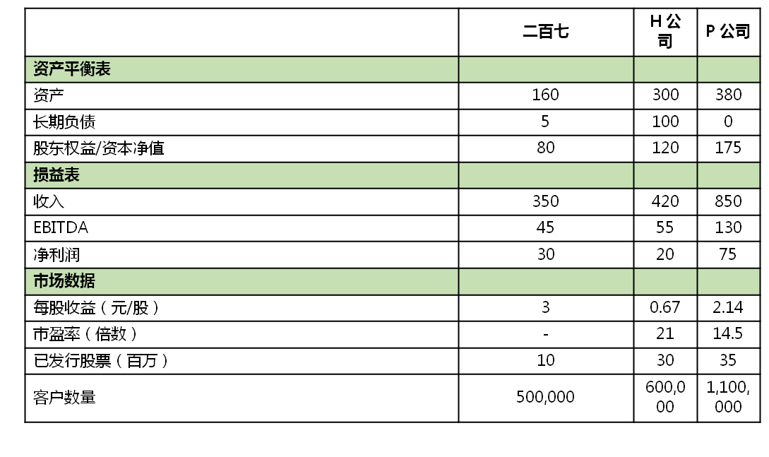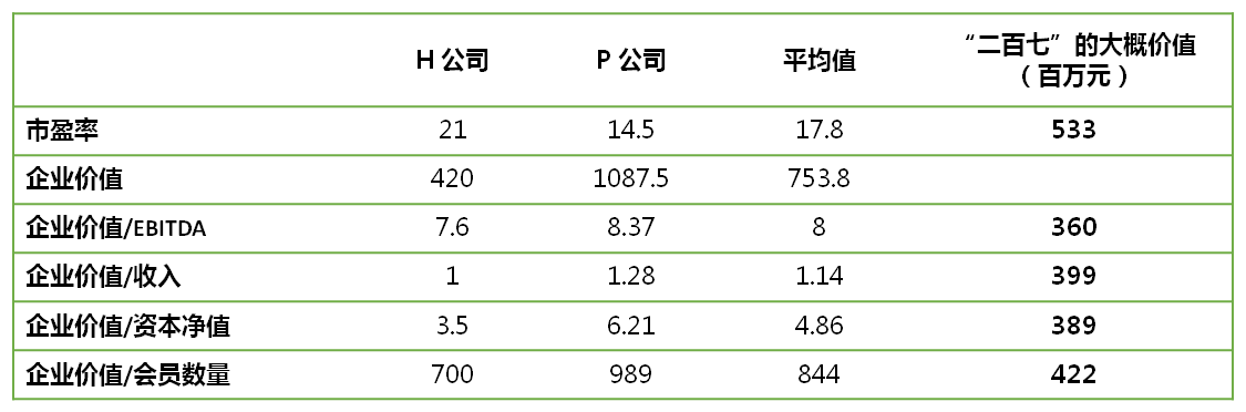 综合来看,小Z认为这些数据给公司的估值提供了很好的参考,但是市盈率的倍数一定要调整了。这是因为H公司(资产负债率为33%)的杠杆率大大高于”二百七”(资产负债率为3%)。如果用P公司的市盈率(14.5)去估值的话,“二百七“的价值大约为4.35亿元(14.5*30)。根据以上分析,小Z 大致认为”二百七“的价值在3.89亿和5.33亿之间。取中值4.5亿元左右做为评估基数。但是小Z也知道用上市公司来比较私营公司的时候要考虑资本的流动性。正是因为私营公司的股权缺乏流动性,估值也因此需要打个折扣,保守估计在20% 到30%之间,取中值25%。综合判断后小Z认为“二百七“的价值大约为3.3亿元,经董事长王老先生批准后正式向“二百六”公司报价。B同学是第一次接触收购案,于是也进行了差不多的推演,觉得报价合理,准备接受了,一切似乎皆大欢喜,双方都很满意,各取所需。