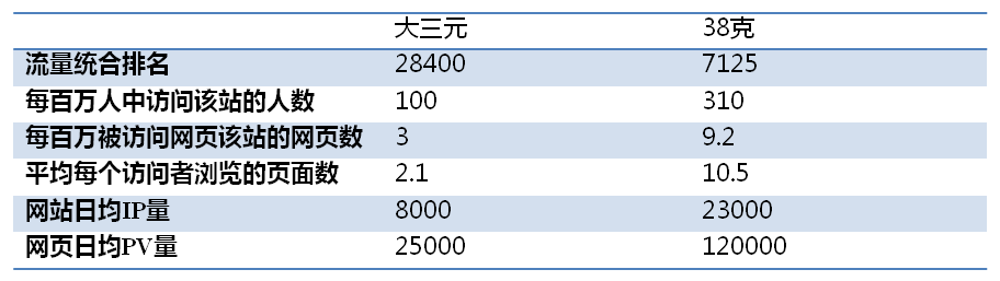 从数据上来说,“38克”网站的整体影响力明显大于“大三元”,日均IP量接近“大三元”的3倍,而在日均PV量上面,“38克”则5倍于“大三元”,平均每个访问者浏览的页面数明显也高于“大三元”,显示更强的内容吸引力和用户粘性。接着A同学又拿出了另一组数据。