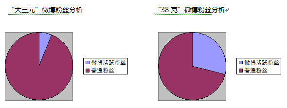从A拿出的上述数据显示,“大三元”的成立之间较之“38克”早了三年,但是网站综合排名、活跃率与点击量都不如“38克”。更为严重的问题是,虽然一直有少许盈利,但“大三元”从前年开始,在用户基数刚刚超过运营平衡点的时候,就出现了明显负增长,网站排名也是直线下降,其覆盖力与影响力已经远远不如其他同行业网站,目前的盈利不过是靠创始人的个人关系以及一些历史合同的延续,而今年合同就要到期了。此消彼长,反观“38克”网站在近两年内,出现了用户数量的快速增长,并且网站排名有爆发式直线上升的趋势,用户绝对数已经大大跨越了行业内企业的平均基数。同时,在微博方面,“大三元”的微博粉丝数量虽多,但是粉丝活跃度明显较低,如此“僵尸粉”纵横的微博,显示了其在行业内各种竞争对手的压力之下,毫无还手之力,持续经营能力堪忧,而且“大三元”有员工10人,而“38克”仅有6人,团队较之前者更轻更富活力。