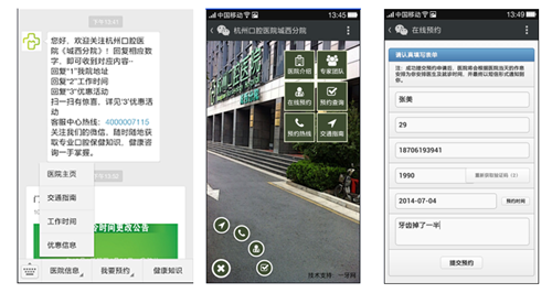 打开微信,添加好友,关注某微诊所的微信公众号。进入某口腔医院的微诊所主页,预约很方便,填写信息后提交申请,半小时左右,医院安排好后会电话或者短信通知预约,在预约查询模块中,输入预约的手机号码,即可查询预约信息,目前没有在线咨询模块。
