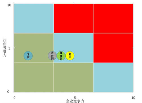 最后Dr. 2 根据移动医疗牙科领域行业分析和4家主要企业的竞争力分析,组建了一个矩阵图以供读者参考: