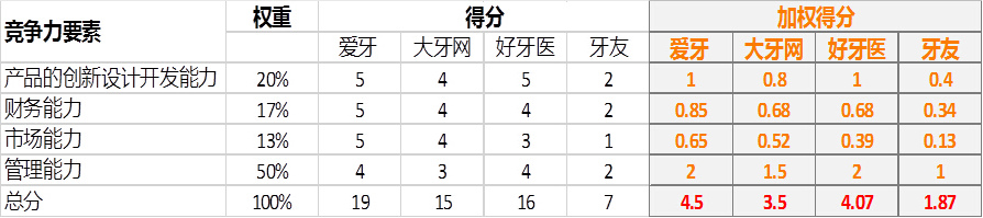 从以上加权计算和权重占比综合来看,Dr.2认为,本研报调研企业的竞争力都比较低,加权得分最高的爱牙也仅为4.5(满分10分)。