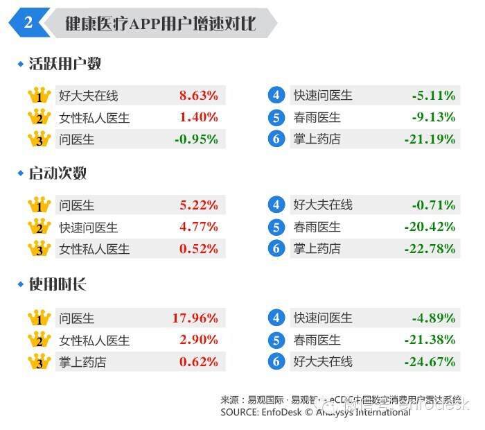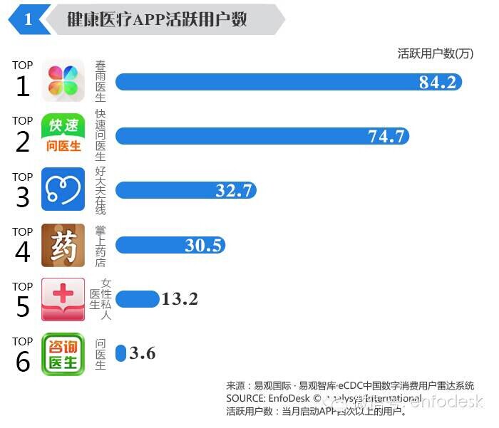 上期我们用了易观国际4月份健康医疗APP活跃用户数统计图,下面我们结合5月份的数据统计图来看,第一名的春雨从4月的92.7万的月活下降到5月的84.2万, APP用户增速从29.2%变成增速-9.13%,其它产品的5月活跃用户数和APP用户增速相较4月,也都是呈下降趋势的。由此我们可以判断目前很多健康医疗APP流量都在往下走,原因是目前行业内新生公司的发展速度较快,竞争越来越激烈。月活第六名以下平台的数据情况早就已经惨不忍睹了,不管承认还是不承认,他们都已经没有太多的统计学意义了。目前整个行业已经被引爆,未来会进入一个持续多竞争格局的发展态势。