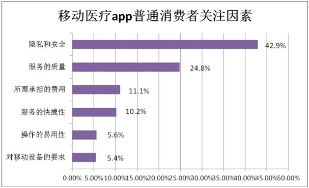 尽管在普通大众的手机里安装医疗类app应用还不是那么普遍,但受整体移动医疗大势所趋,有88.6%的人表示在未来愿意尝试移动医疗的应用。而这些手机用户在选择移动医疗应用时,最关注的因素是医疗服务的安全性和医疗服务的质量,分别占比42.9%和24.8%(图4),在这之后是个人所需承担的费用以及服务的快捷性等。