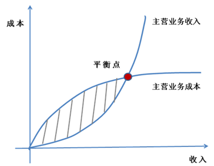 平衡点以后,其主营业务收入的增长和成本上升是不成比例的,函数图形开始发散,甚至有些主营业务成本是下降的(减少了营销预算等),所以这才是我们互联网企业估值的根本逻辑,不存在什么PE20-30倍合理的扯淡,那是卖百货,造钢铁的。