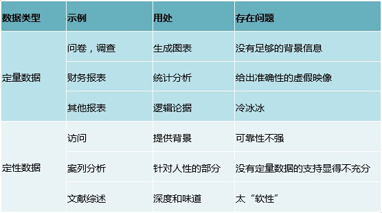 数据一般分为两种形式,定量和定性的。如下面的表1,定量的数据是可以通过具体的数字生成图表的,比如各种报表、问卷调查等;定量的数据精准,有说服力,但我们却很难辨别真假,有时精确到小数点后面好几位是很荒谬的。而定性的数据更多的是通过主观感受去了解实际情况。定性的数据虽然容易分析背景,但可靠性却不强,区间范围过大,也明显缺乏说服力。这两种形式各有利弊,也没有什么完美的模型,所以需要结合起来分析,交互印证。