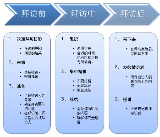 拜访是定性分析的一种工具(见下图1),它需要仔细的计划和准备。将拜访前,拜访中和拜访后这三个步骤,计划得比较准确和具有可操作性,才是成功的拜访。
