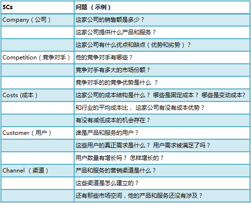 5Cs针对的是一个企业做策略分析,Company(公司),指围绕这家公司所有信息,比如销售额、产品和服务等;Competition(竞争对手),指这家企业的竞争情况和竞争优势。Costs(成本), 指这家公司的成本结构是什么,固定成本和变动成本是多少?Customers(用户), 指产品的用户是谁,集中在哪些群体,用户需求满足了吗?Channels(渠道),指产品和服务的营销渠道、推广方式等。在任何时候,给自己的企业、竞争对手或者收购对象都可以采用这种分析工具。