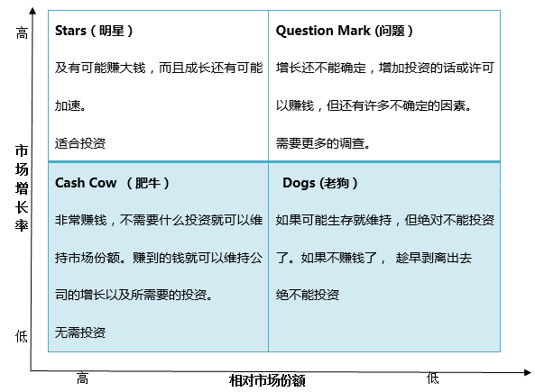 见下(图2),横轴是产品和服务相对与竞争对手的市场份额;纵轴是产品和服务的市场增长率。如果市场增长率和相对市场分额都高,就是明星,极有可能赚钱,而且成长性大,适合投资;如果市场增长率低,相对市场份额也低的话,那就是老狗,能生存就尽量维持,但绝不能投资了,如果不能挣钱或者亏损了,要趁早剥离出去。