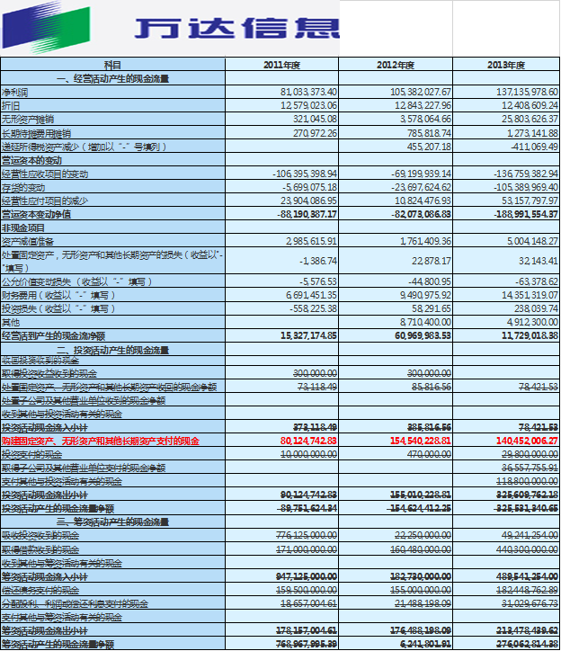 现在,我们要预测2014年的资本支出。我们还是先看看过去三年资本支出的情况。我们从万达信息年报里找到过去三年的合并现金流量表。我们来比较一下, 如下表18-3所示: