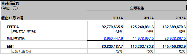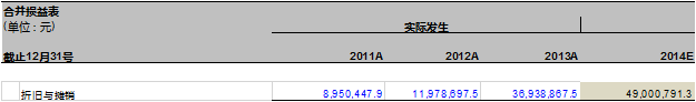 在调整后的利润模型里,折旧和摊销从管理费用里分离出来,单独放在EBITDA的下面。我们现在要预测万达信息2014年的折旧与摊销。