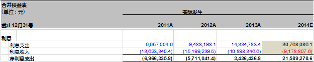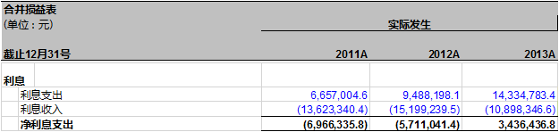 其过程推导十分复杂且烧脑,我们直接发结论吧。用计算好的利息支出减去利息收入就得到2014年万达信息的利息费用净额了:30,768,086.1-9,178,807.6 = 21,589,278.6元。如表20-12: