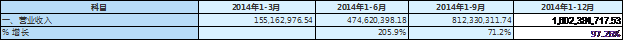 2013年最后一个季度的收入为 610,846,977 元 (1,213,069,756.79-602,222,779.22),比前三季度的总和增加101.4%。2012 年最后一个季度的收入为 426,525,807元(884,744,328.7-458,218,521.18),比其前三季度的总和增加93%。我们有理由相信2014年最后一个季度也会如前两年一样有大幅增长,我们百家乐技巧取增长率的平均值 97.3%,得出2014年的营业收入为1,602,384,717.53。正好也在我们预测的范围之内。综上所述,我们认为万达信息2014年总营业收入为1,636,667,929.5元。