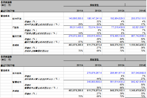 a. 2014年总营业成本为1,149,470,634.3元,比2013年同比增长35%。用这个数据除以2014年总营业收入,正好等于70%。完全符合我们的假设。其中民生服务的成本增长7%,这比2013年的增长率6%稍微高一点。我们暂时认为这个增长率还算合理,起码他符合了我们在计算成本时采取的保守性原则。这样2014年民生服务成本占总营业成本的比例为27%。这个比例和民生服务的收入占营业收入的比例一致。同样,这也印证了民生服务成占总营业成本的比例逐年下降的假设。智慧城市成本在2014年占总营业成本的73%,依次类推,我们相信智慧城市的成本在2014年同比增长50%。这样我们也可以看到智慧城市成本占营业成本的比例会在未来数年逐步上升。这和我们之前的假设一致。基于2014年整体营业成本同比增长35%,以及智慧城市成本的同比增长50%,我们倒推出民生服务成本的增长应为7%,而不是6%。