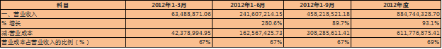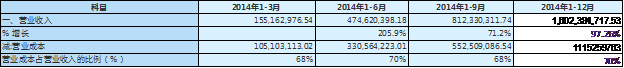 我们可以发现一个规律,那就是过去三年,无论哪个年度,年度的营业成本占营业收入的比例都较季度比例略高2个百分点。因此我们选择70%作为预测的结果又一次得到了交互印证。这样其2014年总营业成本为1,149,470,634.3元。