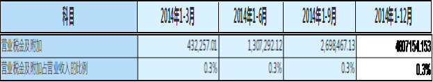图表清析地显示2014年前三季度,万达信息所记录营业税金及附加占营业收入的比例均为0.3%。再看看过去两年均有类似的情况发生。所以0.3%符合预期。