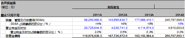 a. 万达信息2014年的销售,管理和行政费用占营业收入的比例为15%。这个数字是根据过去三年的历史数据推算出来的。我们同样用以下几种方式来推算: