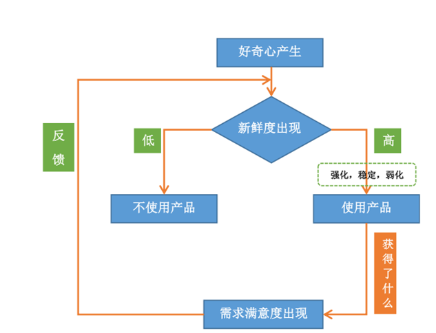 这儿在使用过程中,又隐含的一种关系:当获得从产品而来的需求满足度高,新鲜度高时,使用次数会多,使用时间会长,需求满足度进一步调整。需求满足度一般,新鲜度也保持在一般水平时,使用次数和使用时间会维持稳定。 然而当需求满足度低了,新鲜值相应变低时,使用次数变少,使用时间变短,粘连度变低。这预示着产品周期接近尾声,需要新刺激介入来刷新新鲜度和需求满足度。