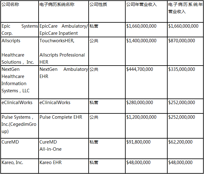 在美国医药经济杂志公布的《2014电子病历系统营收排名Top50》中,2014年问鼎电子病历年营业收入榜首的公司就是他们,该公司的电子病历系统名为EpicCareAmbulatory和EpicCare Inpatient。不过Epic是非上市公司,也不需要公布具体的财报收益,而根据该杂志在网上公布的信息,此排名的主要依据为公司通过电子病历系统所产生的营业收入。