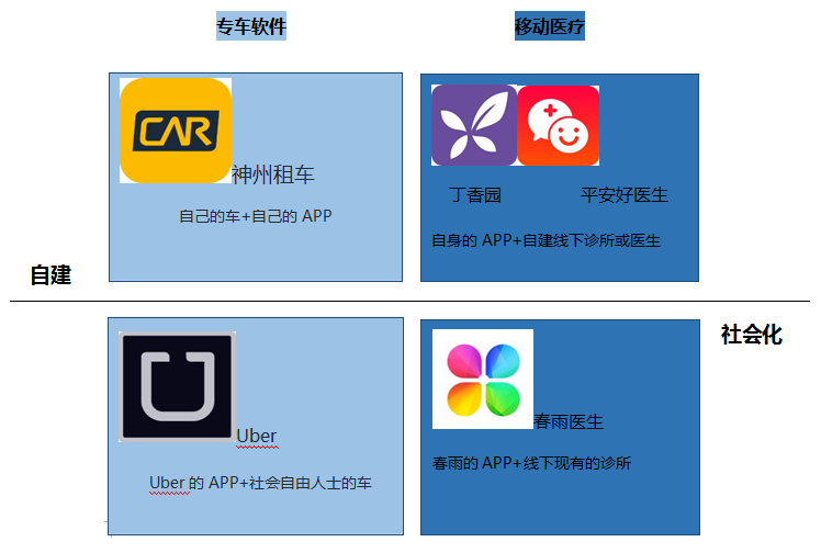 专车有两种方式,第一种是神州租车,包括滴滴快车,它们有自己的车;第二种是Uber的方式,也就是社会化用车,然后全部通过信息流协同。这是两种路线,一个是自建,一个是社会化。社会化又是借助第三方,实际上移动医疗也是一样。春雨和好大夫不是自建医生团队的,它跟现成的医疗机构和医生合作,就像你现成有车,然后我把流量导给你,你去做,我来分成,它是一个Uber方式。丁香园是神州租车方式,全部都是自建的,他们自购固定资产,自己招医生,使用这种模式的还有平安好医生。移动医疗发展到一定阶段就会出现这种专车模式,然而它还可出现其他模式。例如挂号网和如医,虽然它们借助了体制内的医生,但是最终是想把体制内医生和患者释放出来,未来建立体外循环,却未必肯定会进行类似实体重资产投入,介于上述两种模式之间。其实自建和社会化本身也是对手盘关系,社会化的成本比较低,但是难以把控;而自建就需要企业拥有较强的资本、产品和营销能力。无论是哪种模式,都不可能由类似“出租车公司”的传统企业做成。换句话说,在进行医疗的互联网化时,医院和医药厂商做到一半的时候,他们基本上就截止不前了。如果变成另外的一个公司,最后反过来颠覆自己,那就要放弃原有的产业,那是非常艰难的。医疗的互联网化和互联网医疗,初期从表面上来看似乎差不多,还有很多人认为似乎传统企业去做,更为靠谱,但从商业形态、逻辑和终极目标上说,两者完全相反。
