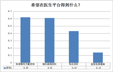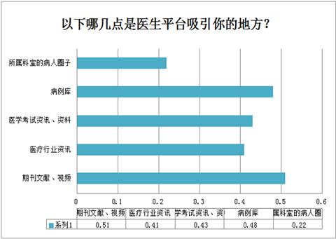 文献和视频的学习方式受欢迎程度之高,再另外两道调查题中也得到印证,是最吸引医生的几个需求,当然这可能是低频行为。值得注意的是病例库。相关病例资料也是医生的严重关注的一个需求点,仅次于文献。其他的考试资料,行业资讯等关注度也是不低的。医生对病历规范采集的需求被不少公司忽视或者没有引起重视,在这个情况下,病历夹APP虽然不是综合类软件,但在主打病历这一垂直领域仍然获得了不少医生的亲睐。