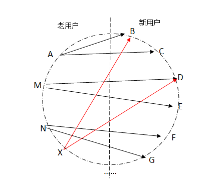 比如,用户A邀请了B和C这2个人,用户M邀请了D和E,用户N邀请了F和G,但是他们的圈子里的人数是有限的,那么用户X在发出的邀请可能又会发给了B和D,即可能产生多人邀请同一人的现象(见图2)。这是小众社区独特的“闭环圈层”概念,对病毒营销有天然的防御,甚至未来还有反作用。