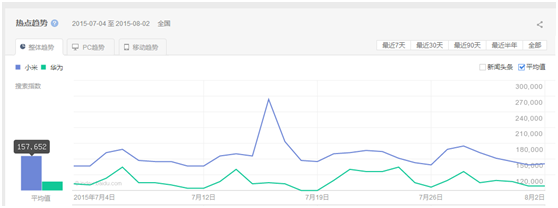 如图所示:小米的关键词指数平均是华为的1.5倍。而小米在7月16日出现了一个指数峰值,经过查询发现,小米在2015年7月16日举行了小米新品沟通会。