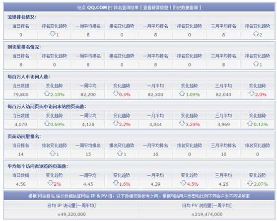 Alexa排名(http://alexa.chinaz.com/)可以查询指定网站的全球排名、中国排名、页面访问量、平均每个访问者流量的页面等多个评价指标信息。