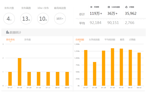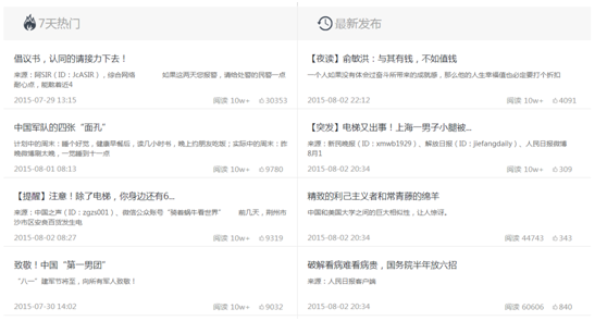 我们在进行企业营销总结和竞品分析的时候,使用新榜能够最快速的总结出目标微信号的一段时间内的发布情况,包括日均发布文章数量,发布频率,平均阅读数,以及分类榜单排名情况等数据。同时对于微信近段时间内阅读量较高的文章也直接设置了排行,一目了然。所以,我们能够根据新榜的数据来对微信的粉丝数量和微博的传播质量进行一个大致的判断。
