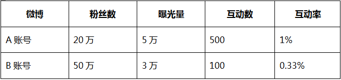 过了几天后我发现,我的微博投放给A账号后,A的曝光量有5万,互动量是500,互动率为1%。B的曝光量有3万,互动量是100,互动率为0.33%。