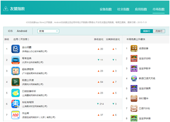 友盟根据App Store公开数据,以及Android主流应用市场公开数据计算做出了一个友盟指数,对各类APP应用做了一个友盟自己的排名,这个排名准确度并不是特别高,但是可以在竞品分析的时候进行辅助参考。