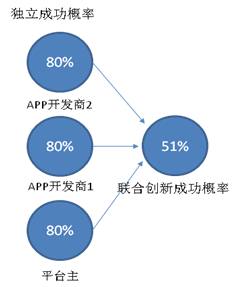 结构性复杂对生态系统内的创新有重大影响,因为它放大了共同创新的风险。我们来比较一下联合概率和独立概率的区别。我们就拿移动医疗举个例子:假如2个APP开发商和我们需要联合创造一个全新的手机APP。我们假设每一方都只有80%的把握来完成他们的部分,那么成功完成这个APP的可能性则远远低于80%。这是因为实现创新的三方依赖关系是联合概率,而不是独立概率。APP成功的可能性只是可怜的51% (80%*80%*80%)。这就是说,尽管三方都相当有可能履行承诺,但三方联合在一起的成功率只有50%。虽然任何一方可能都对合作成功充满信心,但现实很骨感。通过这个例子大家可以看出,随着进入生态系统的平台方数量越来越多,共同创新的风险也就越来越大 。