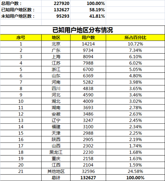 注:本图为已知地区用户分布情况,不包含未知地区