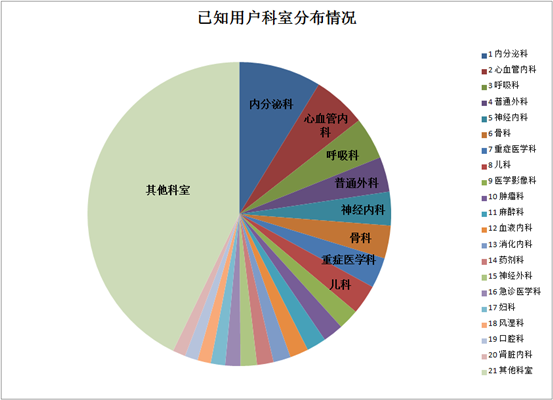 看一下珍立拍用户科室分布情况,其中内分泌科使用珍立拍的医生最多,约为1.1万人。心血管内科约占7000人,呼吸科约占5500人,普通外科、神经内科、骨科和重症医学科的用户数各占4500人左右,各科室用户分布较广。