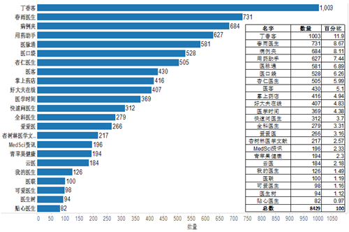 这是三个月前有3346个珍立拍用户参与的调查,使用APP数量为8429,其中丁香客使用数量居于冠首为1003占总量的12%,春雨医生其次为731占总量的9%,病历夹第三为684占总量的8%。具体使用数量和寡众如图一所示:
